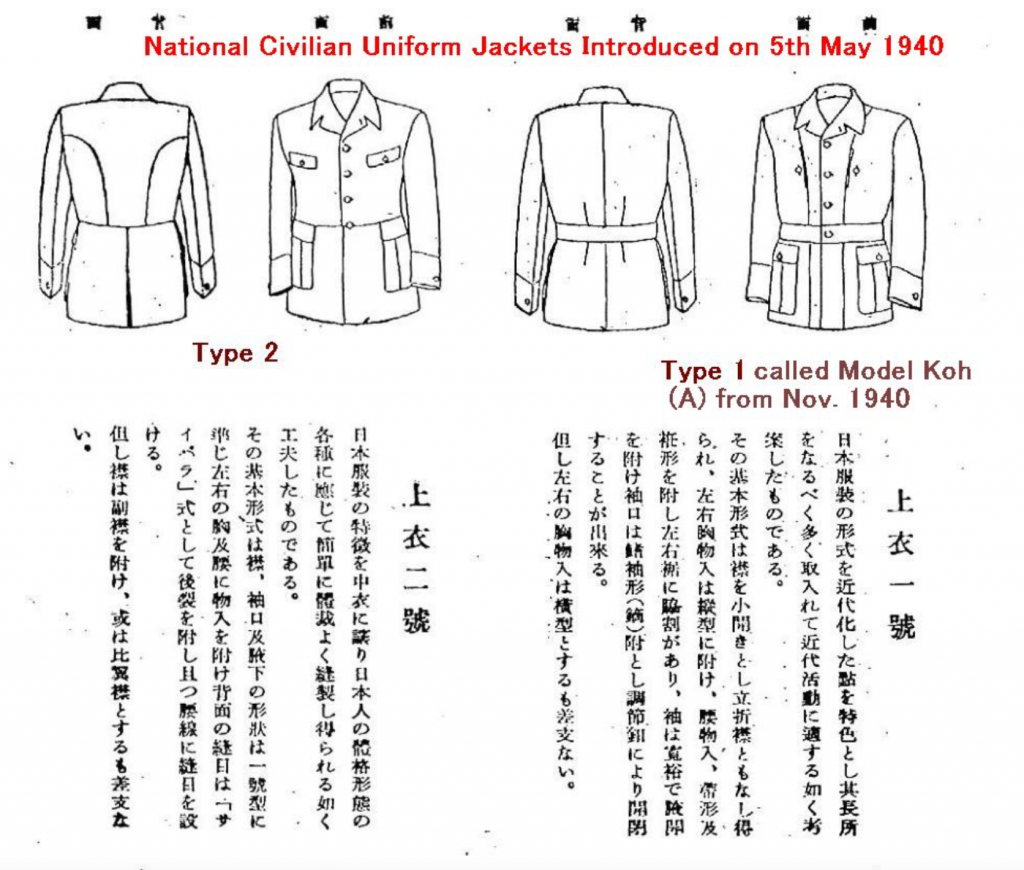 As for uniforms, all the images from the series on jodo kihon show the kihon being done in what may be a police uniform, but could also simply be contemporary men’s dress; this was the Kokumin fuku outfit that was patterned on the army’s tunic and made in any color you wanted as long as it was something combining green, brown, and gray. This militaristic cut of jacket, pants, and cap had been proclaimed (by Imperial Edict!) as the national form of dress for men in 1940. The image below is from research done by the late Nick Komiya, who conducted years of work into Japanese military gear and policies. His discussion of the Kokumin fuku is available here: https://www.warrelics.eu/forum/japanese-militaria/national-civilian-uniform-1940-a-677200/ His contributions to discussions on that forum (including gunto sword research) is indexed here: https://www.warrelics.eu/forum/japanese-militaria/master-index-reference-articles-written-nick-komiya-691796/ .