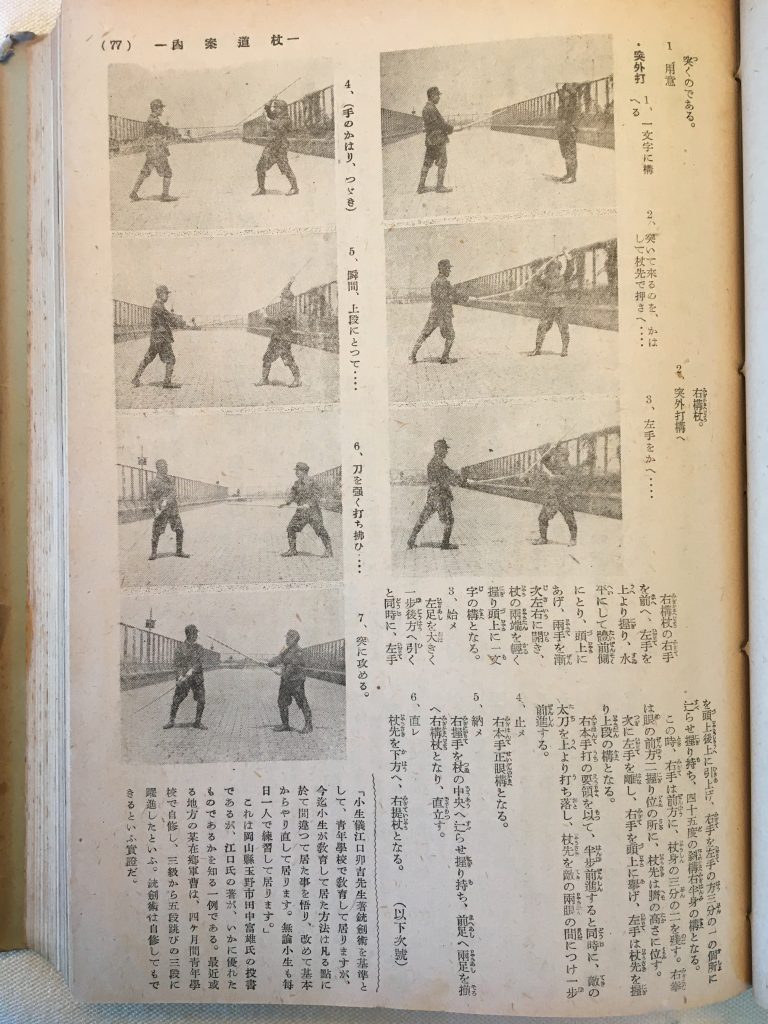 Whether Shimizu is wearing his Kokumin fuku jacket or perhaps a police uniform is hard to discern in these pictures as the tunic and leggings of the popular clothes are virtually identical to the army uniform and probably the police uniform as well. This style of dress was common already in school uniforms. The students, scouts and young martial artists the magazine was aimed at would certainly have felt at home seeing the “military” uniform of the day as dress for practicing a modern martial art.